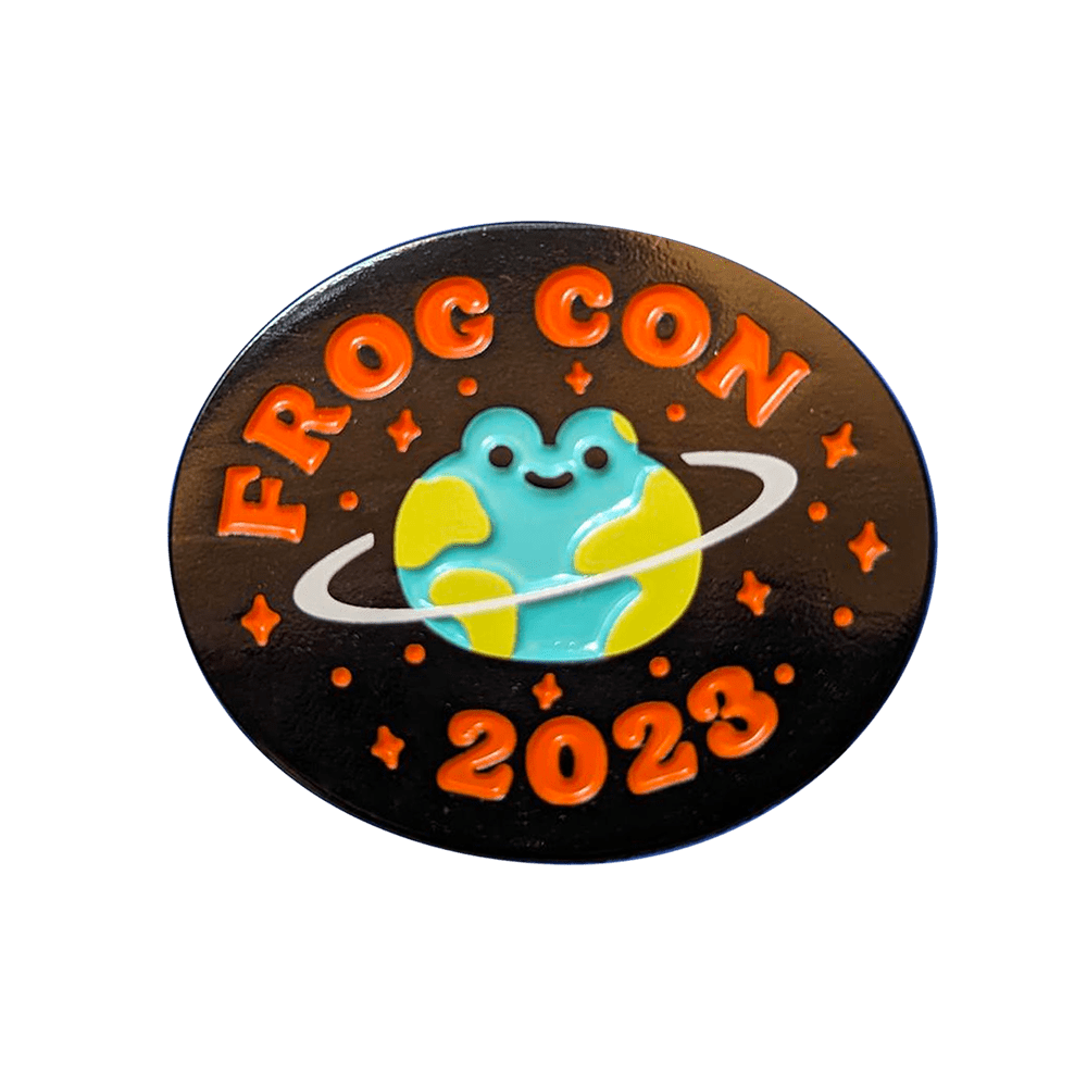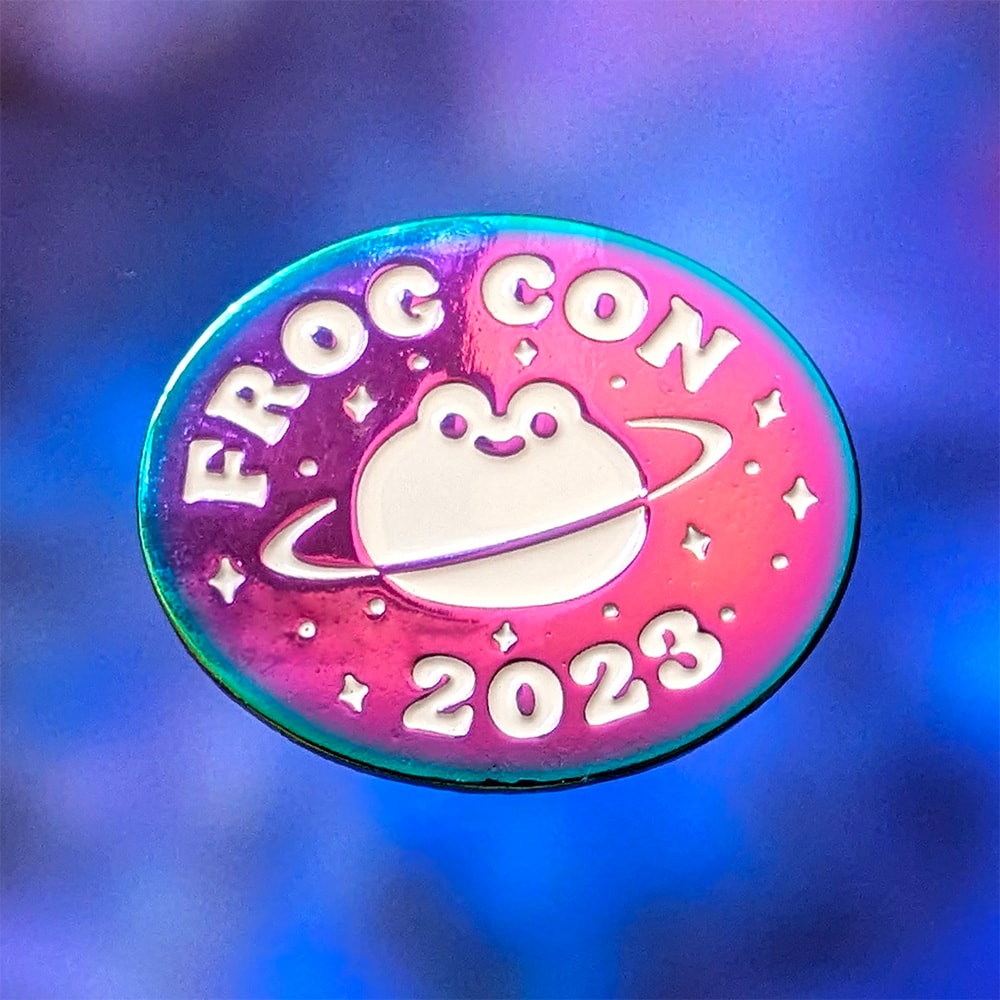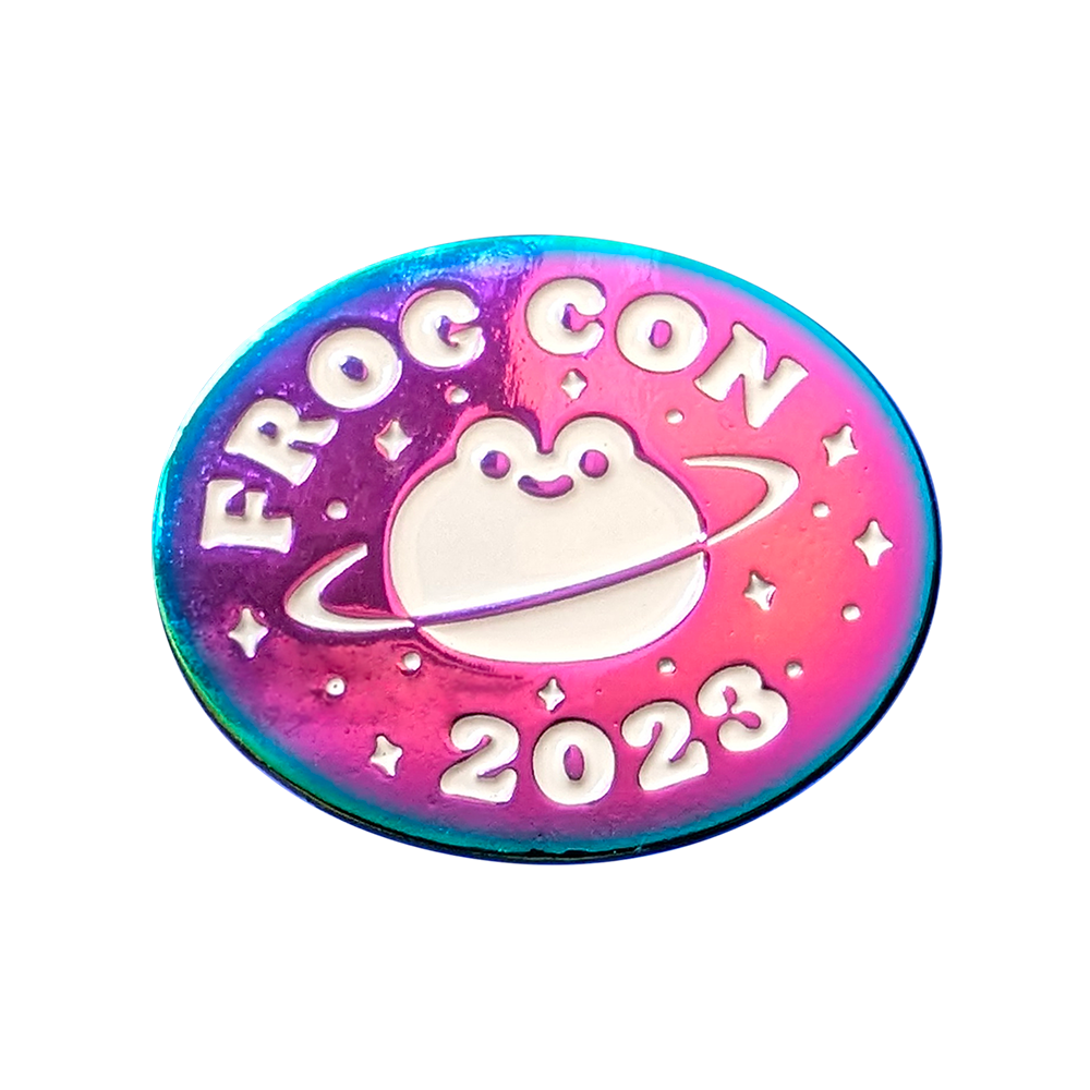 Commemorate Frog Con 2023 with these limited edition pins of the logo! Available as a dip-dyed soft enamel pin, as well as a shiny rainbow metal pin.